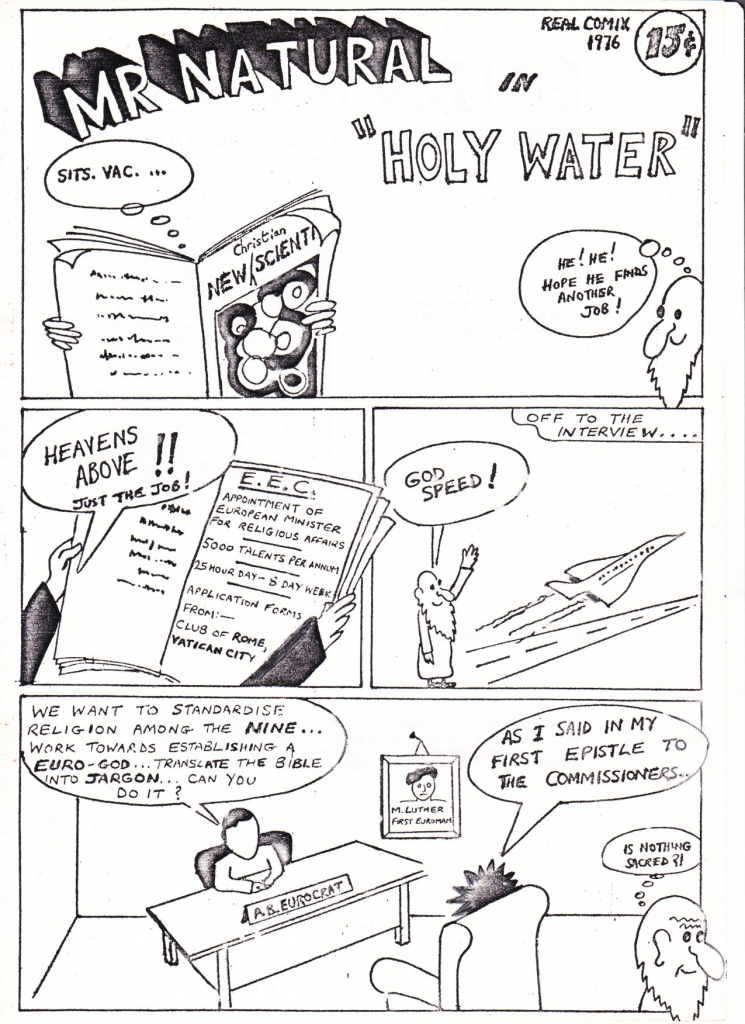 Mr Natural in ‘Holy Water’ Mr Natural’s first outing for Yorkshire Water – one of four in the first edition of The Village Pump (1976).